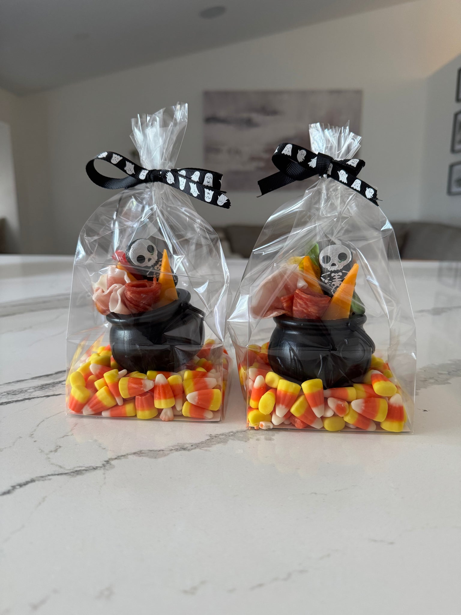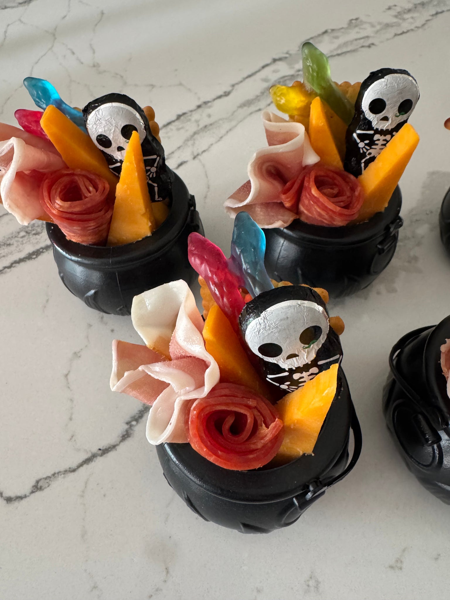 A tasty treat for a spooky lunch, these mini cauldrons have cheese, 2 meats, and some Halloween treats!
